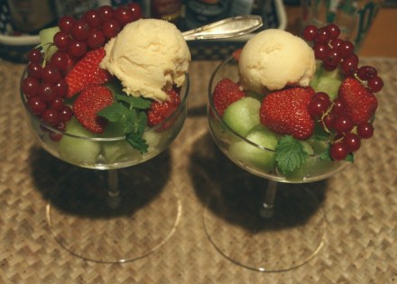 Jedną kulkę lodów, najlepiej po prostu śmietankowych lub waniliowych, tuż przed podaniem umieszczamy na sałatce. Lody można zastąpić mniej kalorycznym sorbetem, na przykład cytrynowym albo cytrynowo-bazyliowym. Do zestawu owoców dodałam czerwone porzeczki. Jakoś mało dzisiaj popularne, a przecież kwaskowate i bardzo orzeźwiające. Mnie kojarzą się z krzaczkami rosnącymi w ogródku babci. Zrywanie gronek nagrzanych słońcem jest jednym z pyszniejszych wspomnień z dzieciństwa. Toteż dla mnie porzeczki mają smak lata i kupuję je, gdy tylko widzę. Bo własnych krzaczków niestety nie mam.