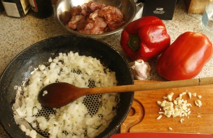 Oczywiście, jak to u mnie, bez lekkich zmian się nie obyło. Mięsa było mniej (40 dag). Zamiast smalcu był olej. Paprykę wzięłam nie zieloną, lecz czerwoną. A pomidora na pewno było więcej niż w przepisie. Był też jeden, ale za to wielki, jak to bawole serce. Dlatego mięso zginęło w treściwym, pomidorowo-paprykowym sosie. Papryka w proszku z przepisu jest oczywiście słodka.