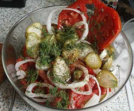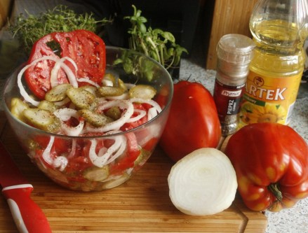 Z pomidora skroić plastry, a je pokroić w paski. Ogórki pokroić w plasterki. Cebulę w cienkie krążki, które rozdzielić. Układać warstwami pomidory, plasterki ogórków i krążki cebuli. Skrapiać olejem, umiarkowanie solić i pieprzyć. Z wierzchu sałatę posypać posiekanym koperkiem. Na stole postawić sól i młynek z pieprzem.