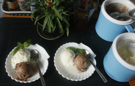 A teraz moje wersje. Ponieważ maszynka ma dwa kubki, daje możliwość przygotowania lodów w dwóch smakach. Na początek szaleństw: obok lodów waniliowych (do śmietankowych dodaje się wanilię zeskrobaną z laski, sypką, ekstrakt, ew. cukier wanilinowy) ukręciłam lody czekoladowe (do masy podstawowej dołożyłam rozpuszczone w mikrofalówce lub na parze pół tabliczki czekolady wytrawnej). Lody podałam z listkami bazylii.