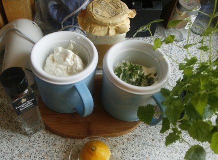 Kolejne były lody śmietankowe ukręcone z miodem w miejsce cukru i listkami melisy oraz ze skórką i sokiem z cytryny. Zamiast melisy można wziąć i świeżą miętę. Powstała kompozycja ciekawie orzeźwiająca.