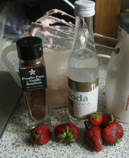 A te drugie lody truskawkowe nabrały rewelacyjnego smaku dzięki dodatkowi wody różanej. Można ją kupić wszędzie tam, gdzie sprzedają produkty orientalne. Jest znakomitym dodatkiem do deserów (i nie tylko, ale to inna historia).