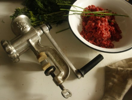 Słówko o mielonym mięsie wołowym. Czasu oszczędzi nam kupienie gotowej mielonej wołowiny dobrej jakości. Ale jeżeli zmielemy kawałek mięsa samodzielnie, będziemy pewni jego jakości. Lubię mleć w starodawnej maszynce żeliwnej. Roboty kuchenne mięso mielą za mocno, a właściwie je rozcierają. Takie nie pozwoli uzyskać właściwej konsystencji farszu. To już lepiej kupić mielone gotowe.