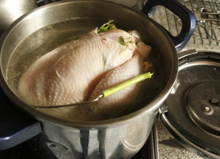 Do dużego garnka wlać wodę, na spód włożyć oczyszczone warzywa oraz podroby z kurczaka i ew. pozostałości z obierania mięsa z błonek itp., zagotować. Posolić do smaku. Zagotować wywar, włożyć nadzianego kurczaka, gotować półtorej godziny na małym ogniu lub 3/4 godziny w szybkowarze. Gotując w szybkowarze, warto kurczaka włożyć we wkładkę do gotowania na parze; łatwiej potem go wyjąć.