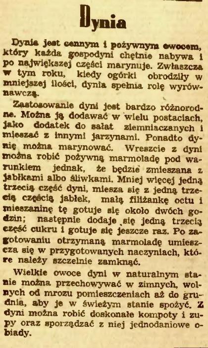 Dynia jest wprawdzie bardzo pospolitą jarzyna, którą jada u nas przeważnie lud wiejski, lub nawet dają bydłu, jednak przyrządzona odpowiednio, jest wcale smaczną i delikatna, a że jest bardzo lekko strawną, nadaje się przede wszystkim dla osób ze słabym żołądkiem. (…) Przekroiwszy dynię nawpół [!], wygarnąć ze środka łyżką pestki i wodę, okroić kawałek z wierzchniej grubej skóry, sparzyć wrzącą wodą i poszatkowana lub pokrojoną w kostkę, przyrządzić jednym z podanych niżej sposobów.