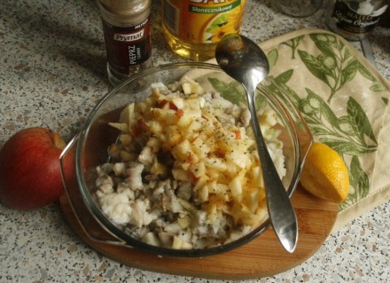 Filety przesiekać tasakiem lub szerokim nożem. Wymieszać z jabłkiem, cebulą i czosnkiem. W słoiczku sporządzić sos – najpierw, wstrząsając, wymieszać ocet z solą i pieprzem, potem, znów wstrząsając, połączyć go z olejem.