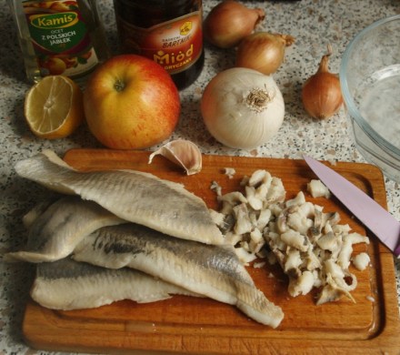 Śledź jest słony, dlatego ja sosu do niego już nie solę. Lecz jeżeli ktoś uzna, że jest mało wyrazisty – niech go dosoli. Z miodu można w ogóle zrezygnować, lub dać go mniej. Nie każdy lubi smaki słodko-słone. No i nie każdy lubi czosnek…