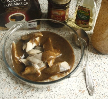 Z miodu, musztardy, cukru i octu winnego sporządzić zalewę do śledzi. Wymienione składniki włożyć do słoja, zakręcić go szczelnie, wstrząsać nim tak długo, aż cukier się rozpuści. Dodać olej, kawę i sól (nie za dużo, bo śledzie są słone). Wstrząsaniem osiągnąć jednolitą emulsję. Sosem zalać śledzie. Podawać co najmniej po sześciu godzinach marynowania (przepis nakazuje czekać godzin dwanaście).