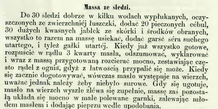 Gdyby tak panie, nie mogące codzień pozwolić sobie na mięso dla rodziny, zechciały popróbować zastąpić je parę razy przez śledziowe potrawy, że pozwolę sobie przypomnieć tylko: forszmak ze śledzi, kotlety śledziowe, babkę śledziową, śledzie smażone z różnemi sosami, śledzie smażone w cieście, śledzie zapiekane z ziemniakami w śmietanie, wyborną śledziówkę (rodzaj gęstego sosu ze śledzi, śmietany i jaj) podawany do gorących ziemniaków, jajecznicę ze śledziami, omlet ze śledziami. Jestem przekonana, że doświadczone gospodynie dodadzą do tego cały szereg kombinacji mnie nie znanych.
