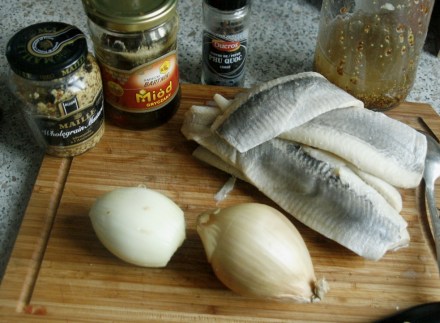 Mój trzeci pomysł na śledzia także zawiera miód gryczany. Z jego udziałem – też w słoju, w sposób podany wyżej – sporządzamy sos miodowo-musztardowy. A tym razem bierzemy musztardę starofrancuską, z ziarnami gorczycy. Do składników nie dodałam octu – musztarda jest dostatecznie kwaskowa. Powstał śledź w sosie musztardowo-miodowym.