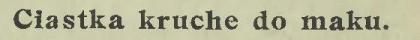 Pół f. masła, 1/4 cukru, 1 f. mąki zagnieść, wynieść na zimno, jak stężeje, wałkować na grubość palca i wycinać foremką ciastka dowolnej wielkości; posmarować jajkiem, posypać migdałami posiekanymi słodkimi, pomieszanymi z cukrem i upiec pod blachą — do tego podaje się mak biały, który trzeba namoczyć na parę godzin lub dziś na jutro w zimnej wodzie, odmieniając ją parę razy, następnie sparzyć gorącą wodą i trzeć w donicy, dodając cukru z wanilią i parę łyżek śmietanki — mak w ten sposób przyrządzony podaje się na wieczerzę wigilijną, ale w takim razie ciasto wałkuje się cienko bardzo, wykrawa się je małą szklaneczką od piwa, smaruje jajkiem i upieczone do rumianości wkłada się szeregami w mak, ułożony zgrabnie na salaterce, najlepiej szklanej, co ładnie wygląda.