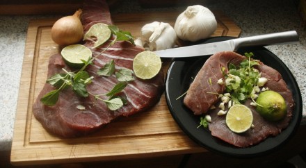 Płaty tuńczyka posmarować oliwą, skropić sokiem z limonki i posypać pieprzem. Na jeden położyć posiekany czosnek i listki kolendry. Na drugim rozłożyć listki bazylii. Na obu położyć plasterki limonki. Odstawić na kwadrans.