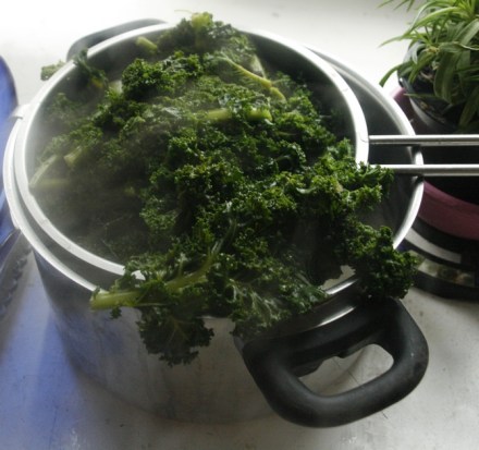Liście, po usunięciu z grubszych łodyg, krótko obgotowałam w osolonej wrzącej wodzie. Odcedziłam. Przesiekałam. Zasmażyłam na patelni, ale bez mąki. Można to zrobić na oleju lub maśle, najlepiej klarowanym. Troszkę posłodziłam (trzeba sprawdzić, czy soli wystarczy). Na końcu dodałam solidną łyżkę śmietany kremówki. Taki jarmuż można przyprawiać dokładnie tak, jak szpinak. Ten z masłem lub na delikatnym oleju – sokiem z cytryny; ten na oliwie – wyciśniętym czosnkiem. Śmietana nie jest wtedy potrzebna.