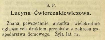 Niewiele w tym treści. To był już schyłek pracy i życia osobowości tak silnej, znanej w całej Warszawie, a przy tym autorki niegdyś bardzo płodnej, pomysłowej i elokwentnej oraz umiejącej się reklamować bez fałszywego wstydu. Gdzieś po upływie pół roku w „Tygodniku” ukazał się nekrolog pani Lucyny. Oznak wielkiej sympatii w nim nie ma. Była osobą trudną we współżyciu, a w ostatnich latach pewnie zgorzkniałą i niezbyt lubianą.