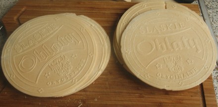 Te wafle, nazwane oblatami śląskimi (co widać na zdjęciu), nawiązują do słynnych wafli karlsbadzkich. A te to czeskie karlovarské oplatky. Były tak znane, że klasyczny przepis na ich upieczenie podawała Lucyna Ćwierczakiewiczowa. Nazywała je „opłatkami karlsbadzkimi”, kazała piec w specjalnych formach smarowanych „masłem klarowanem koniecznie”, na ogniu „nie od węgli kamiennych, ale od drzewa”, posypując szczodrze „cukrem z migdałami i wanilją” (bez tego będą takimi opłatkami, jakich nam trzeba do piszyngera). Ostrzegała przy tym, że sztuka wyrobu tych opłatków nie jest łatwa: „Chociaż pierwszą razą nie będą zupełnie dobre – nie trzeba się zrażać, bo wprawa i równość ognia gra tu wielką rolę, za trzecim razem muszą już być dobre”.