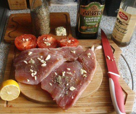 Kotlety z tuńczyka natrzeć ziołami i oliwą, posypać czosnkiem. Pomidory przekroić na pół, przyprawić je tak samo jak rybę. Odstawić co najmniej na kwadrans.