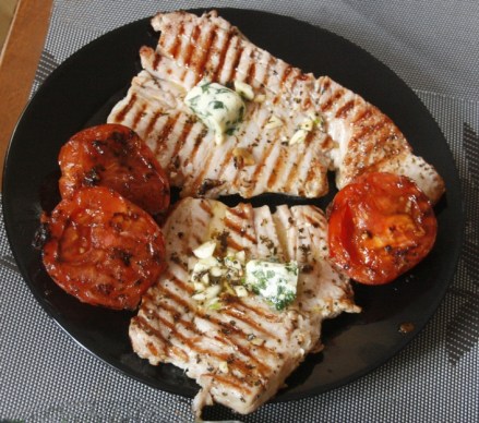 Rozgrzać mocno patelnię, smażyć steki z ryby oraz połówki pomidorów. Podawać z bardzo zimnymi kostkami lub krążkami masła ziołowego.