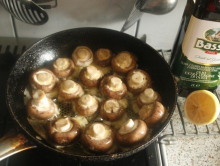 Do takiego tuńczyka zamiast ziemniaków (zwykle pasują frytki) można podać smażone grzyby. U nas były to brązowe pieczarki, nazywane dzikimi lub łąkowymi. Nie obieramy ich ze skórki, tylko starannie przecieramy, a jeśli myjemy, to tak, aby nie nasiąkły wodą od spodu.
