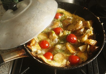Gdy się obsmażą, zalać je jajami. Smażyć jak zwykle omlet, podważając brzegi, aby masa jajeczna spływała na spód. W ścinającą się zawartość patelni włożyć połówki pomidorków, przecięciem na dół. Patelnię na chwilę przykryć, aby ścięły się jajka między ziemniakami. Temperaturę zmniejszyć, aby omlet się nie przypalił od spodu.