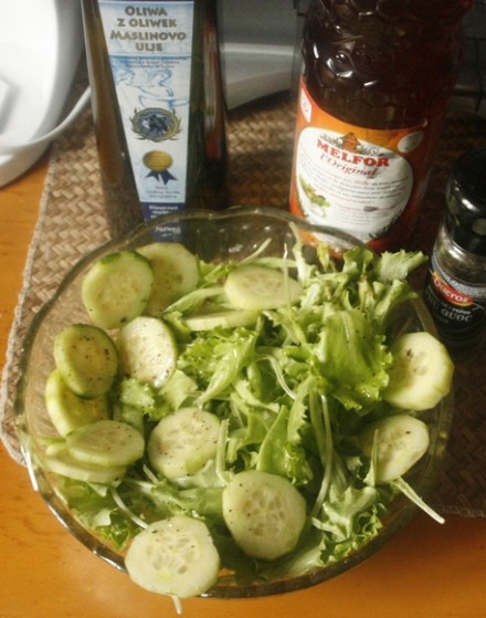 Do tego omletu pasuje lekka sałata. Na przykład ze świeżych ogórków z delikatną sałatą endywią (choć podobno należy ona do rodziny nie sałat, lecz cykorii). Albo każdą inną, doprawioną oliwą, dobrym octem (wzięłam alzacki, miodowy), pieprzem i solą (odrobiną!).