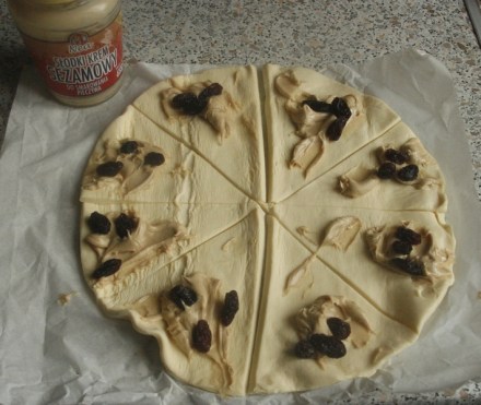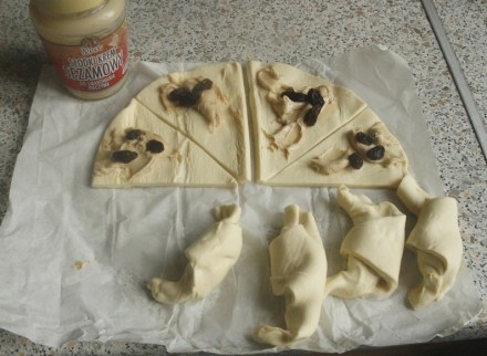 Ciasto rozwinąć na papierze do pieczenia, pokroić na cztery lub osiem części. Na każdą od brzegu nałożyć porcję pasty sezamowej, wetknąć w nią po trzy duże rodzynki.