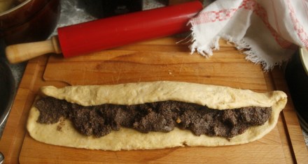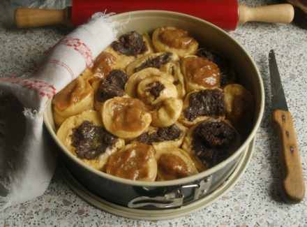 A teraz – kolej na ciekawe ciasto. Niby makowiec, niby briosza. Ciasto drożdżowe plus mak cieszy oczy i długo zachowuje świeżość. Zamiast cukru używa się w nim maku. Jest wygodne, bo nie wymaga krojenia: składa się jakby z drożdżówek do siebie przylegających i łatwo się odrywających.