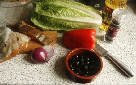 Sałatę i paprykę umyć i pokroić. Cebule oczyścić, pokroić w plasterki lub w kostkę. W salaterce ułożyć paski sałaty i papryki. Posypać cebulą i listkami tymianku. Na tym ułożyć warstwę ryby podzielonej na kawałki. Tak samo układać kolejne warstwy warzyw i ryby. Na wierzchu rozłożyć oliwki, pokrojoną dymkę wraz ze szczypiorem oraz delikatnymi gałązkami tymianku (z grubszych wziąć tylko listki). Skropić oliwą, octem, posypać pieprzem i, oszczędnie, solą (ryba i oliwki są słone).