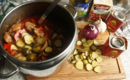 Tłuszcz rozgrzać, wrzucić do niego cebulę pokrojoną w półkrążki, podsmażyć, aż się zeszkli. Dodać do niej pomidory wraz z sokiem, lekko posolić, dorzucić mięso pokrojone w paski lub kostkę. Doprawić wyciśniętym czosnkiem i papryką słodką (łyżka) i ostrą (łyżeczka lub jej pół). Na końcu dorzucić plasterki ogórków.