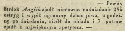 Szczególne informacje, które może zainteresują współczesnych nam obżartuchów, znalazłam w „Kurierze Warszawskim” z roku 1827. Nie wiem dlaczego, ale dotyczą one Anglików. Jeden z nich miał apetyt już od śniadania.