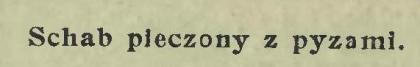 Schab wieprzowy wymoczony parę godzin, następnie zanurzony w wodzie wrzącej i zagotowany dwa razy ostudzić, dopiero posolić i upiec z odpowiednią ilością masła i usmażoną przy pieczeniu schabu cebulą pokrajaną w cienkie plasterki; sosu powinno być sporo, gdyż pyzy go wymagają i bardzo razem ze schabem smakują.