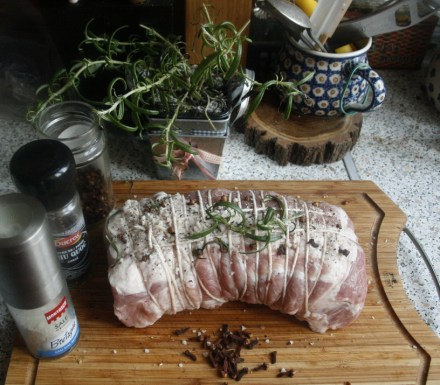 Schab obmyć, osuszyć, związać nicią kuchenną, naszpikować kilkunastoma goździkami, posolić i popieprzyć. Pod nić włożyć dwie–trzy gałązki rozmarynu.