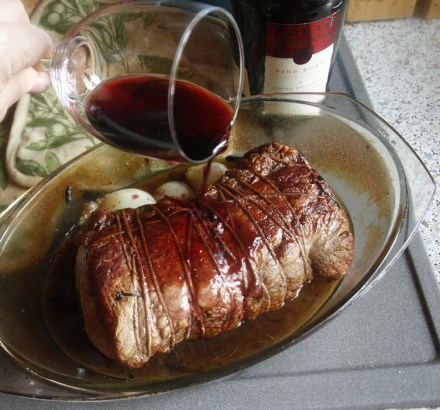 Piec godzinę, polać porto i dopiec mięso jeszcze przez 20–30 minut.