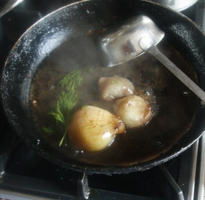 Mięso wyjąć z naczynia, przykryć folią i pozostawić na 10 minut. W tym czasie przyrządzić sos. Płyn spod pieczeni zlać do rondelka, gotować razem z cebulami, aż odparuje i zrobi się treściwy. Spróbować i doprawić do smaku. Jeżeli sos byłby za cienki, można go zagęścić łyżką (pół łyżki) mąki pszennej lub ziemniaczanej.