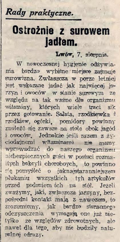 Przyczynę tej powszechnej niechęci do surowizny ukazuje notka zamieszczona w dodatku do lwowskiej „Gazety Porannej”; była to „Kobieta w domu i w salonie”. Pochodzi z roku 1927.