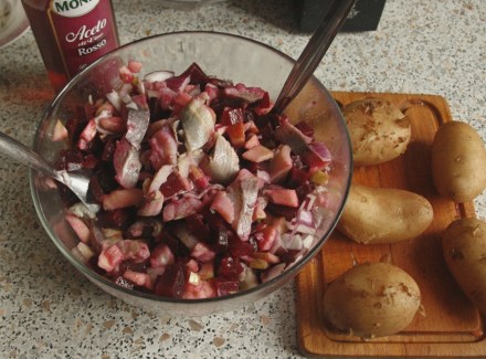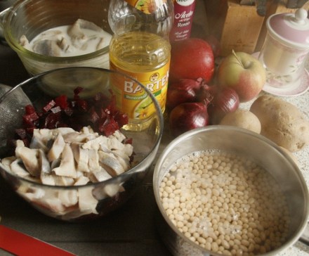 Do sałatki wzięłam drobną białą fasolkę; nawiasem – bardzo długo się gotowała! Warto ją ugotować poprzedniego dnia lub wziąć tę z puszki. Zgodnie z przepisem dobrałam do niej: ziemniaki ugotowane w skórkach i obrane z niej, ugotowane buraki, jabłko (skórkę zachowałam), jedną czerwoną cebulę, drobno pokrojoną. No i winegret z oleju i octu z czerwonego wina. Jako przyprawy użyłam tylko pieprzu. Śledzie pokroiłam w paski, jabłko w drobną kostkę, ziemniaki i buraki w nieco większą.