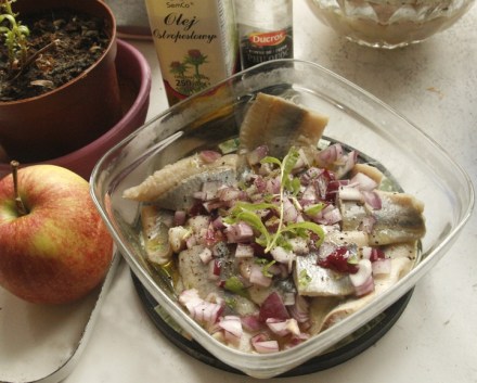 Ze śledziami kupowanymi ze skórą i całym koścem, z mleczem lub ikrą, jest sporo zabawy. Dawno już się za nią nie brałam. Moczenie, oddzieranie delikatnej skórki, wyjmowanie ości, brrr. Wolę kupować wygodniejsze matjesy. Są w postaci prawie gotowych do przyrządzenia filetów. Sięgnęłam po dwa na nie sposoby. Pierwszy, można rzec, tradycyjny. To śledzie w oleju. Pan Halbański radził: „Poszatkowaną cebulę sparzyć wrzątkiem, przelać zimną wodą, skropić octem; filety ułożyć na półmisku, obłożyć cebulą, zalać olejem, przybrać gałązkami naci pietruszki”. Troszkę inaczej podeszłam do tej bardzo prostej sprawy.