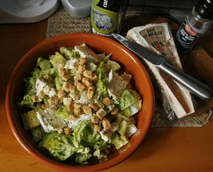 To wszystko. Ser stawiamy obok. Do tego pasuje czerwone wino. Kto się nie boi czosnku, grzanki może obsmażyć na oliwie razem z nim lub dodać roztarty albo drobniutko przesiekany ząbek razem z oliwą. Kto posmak czosnku ceni, ale nie chce go jeść, niech przekrojonym przetrze salaterkę przed włożeniem do niej sałaty. Oczywiście, brie można zastąpić innym serem pleśniowym – z porostem pleśni lub typu bleu.