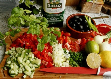 Kaszę ugotować w osolonej wodzie zgodnie z przepisem na opakowaniu (ok. 15 min.). Odcedzić na sitku, ostudzić od czasu do czasu mieszając. Oliwki odcedzić. Warzywa umyć, osuszyć, pokroić w kostkę (pomidorki na pół).