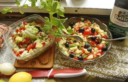 Ponieważ zostały mi pokrojone warzywa, dodałam do nich porozrywane listki sałaty i świeżą sałatkę bez kaszy, a więc idealną „dla odchudzających się”, podałam obok, doprawioną także oliwą i sokiem z cytryny. Nie bójmy się – zwłaszcza do kaszy – dodać go sporo, zostanie wchłonięty i straci kwaśność.