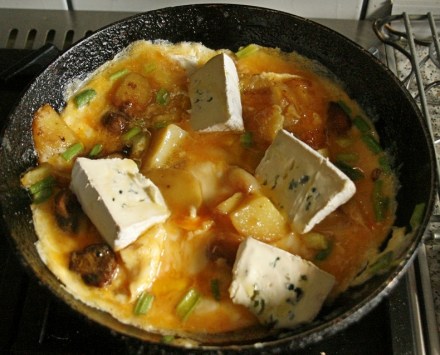 Jajka wybić do kubka, posolić i popieprzyć. Energicznie rozbić miotełką lub widelcem razem ze śmietaną. Na patelni z grubym dnem rozgrzać tłuszcz, smażyć w nim ziemniaki pokrojone w plasterki. Po odwróceniu plasterków na drugą stronę zalać je płynną masą z jaj. Smażyć podważając łopatką, aby z wierzchu spływała na spód. Gdy wierzch jest jeszcze płynny, ułożyć kawałki sera. Przykryć pokrywką na kilka minut, aby ser się zagrzał i nadtopił, a jajka na wierzchy się ścięły. Omlet podawać gorący, posypany szczypiorem.