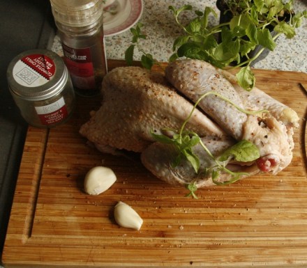 A teraz uwaga wyjaśniająca: z drobiu odcinam zwykle skrzydełka, mało kto chce się bawić ich jedzeniem przy stole; razem z szyjką zostawiam je do gotowania zupy. Ale przy eleganckim obiedzie skrzydełka trzeba zostawić. Teraz tuszki kupujemy często już uformowane do pieczenia: mają związane nóżki, a skrzydełka założone na grzbiet. Zachowują więc ładny kształt po upieczeniu. Jeszcze jedno: wzięłam przyprawy gotowe, ale można je sporządzić we własnym zakresie, z różnych gatunków pieprzu z dodatkiem skórki startej z cytryny.