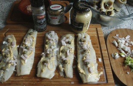 Szalotki pokroić w drobniutką kostkę. Drugą część filetów posmarować musztardą zwykłą, posypać szalotkami, na nie nałożyć kapary. Zwinąć i spiąć.