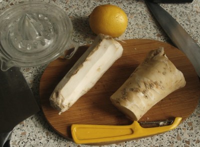 A więc chrzan musi być świeży. Nie kupujemy korzeni wyschniętych czy pomarszczonych. Muszą być jędrne i twarde (mój przekroiłam tasakiem!). Prawdziwą zmorą jest tarcie chrzanu. Mój dziadek, który był domowym ucieraczem chrzanu, robił to na tarce, przy otwartym oknie. A i tak oczy łzawiły mu niemiłosiernie, co mężnie znosił. Ale już przed wojną była na to rada (sprzęt pokazałam na blogu kilka wpisów niżej). Dzisiaj chrzan ucieramy w kuchennym malakserze. Po otworzeniu pokrywy, aby się nie spłakać, utarty chrzan musimy szybko przełożyć do słoika z zakrętką. A potem – doprawiać go cytryną lub octem, by nie ściemniał i nie trzymając za długo otwartym.