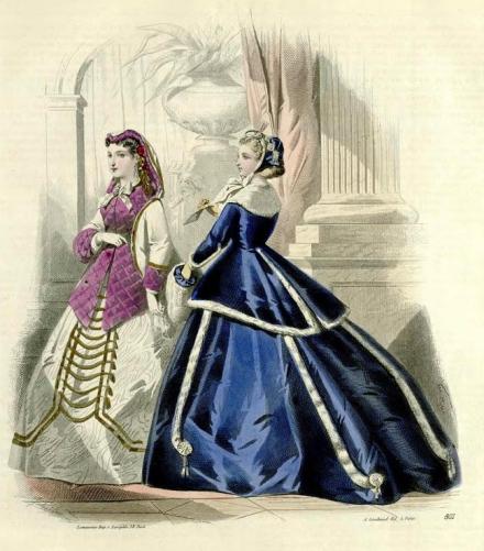 A na koniec jeszcze jeden pomysł na podanie pieczeni z chrzanem, tym razem klasycznej wołowej sztuki mięsa, choć duszonej, a nie gotowanej. Znalazłam go w tygodniku „Bazar” z roku 1865. To pismo dla pań było właściwie poświęcone modzie. Ale próbowało czytelniczki przyciągnąć także kulinariami. Nie udało się. Nie zyskało popularności. Ukazywało się tylko dwa lata. A panie korzystające z podanych w nim przepisów nosiły się wtedy tak: