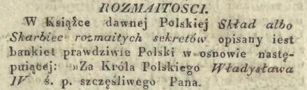 W Książce dawnej Polskiej Skład albo Skarbiec rozmaitych sekretów opisany iest bankiet prawdziwie Polski w osnowie następuiącej: Za Króla Polskiego Władysława IV ś. p. szczęśliwego Pana, gdy Kanclerz Wielki Koronny Ossoliński po domowemu bankietował, albowiem wiedząc iż Królestwo Polskie z łaski Boskiej wszystkiego ma obfitość i dostatek tak dalece, że może się w bankietach Polskich, bez wszelkich drogich zapraw i Kondymentów cudzoziemskich obejść; iakoż na pewny dowód i dokument, ten pomieniony sławny i zacny Senator, pokazał tego sposób i podał manjere.