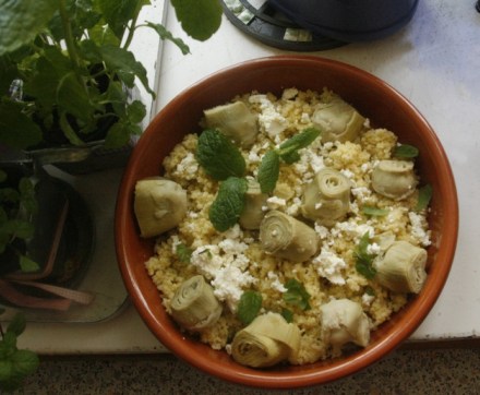 Kaszę gotujemy przez 15 minut wrzuciwszy ją do wrzącej, osolonej wody. Wykładamy na płaski półmisek, roztrząsamy widelcem. Na kaszy układamy serca karczochów, kruszymy ser, skrapiamy oliwą, rozkładamy listki mięty, przyprawiamy pieprzem.