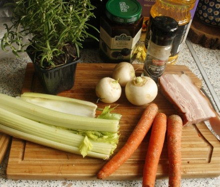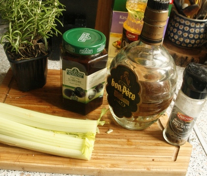 Gałązki selera i marchewki oczyścić, pokroić w nie za cienkie plasterki, a rzepkę w ćwiartki. Dodać do mięsa. Zalać piwem, dodać ziarna ziela angielskiego i pieprzu oraz listki laurowe, kilka gałązek rozmarynu i natki pietruszki (można je związać nitką). Dusić 20 minut w szybkowarze lub 40 bez niego, aż mięso będzie miękkie. W połowie duszenia lub 10 minut przed jego zakończeniem potrawę doprawić powidłami i gruszkówką. Jeżeli potrzeba, dosolić. Dodusić, podawać na gorąco przybrane gałązkami świeżego rozmarynu (wygotowane zioła odrzucić).
