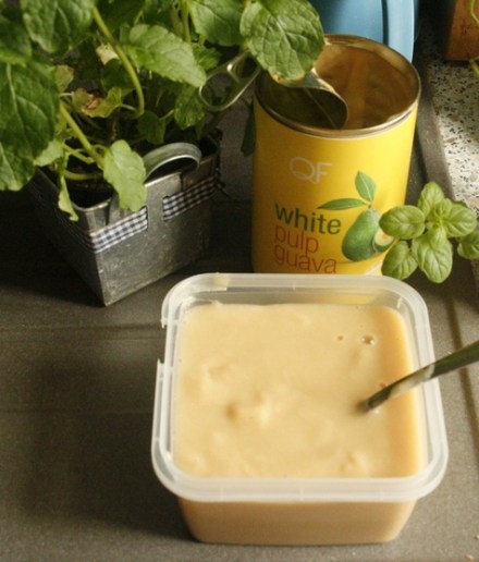 A obiecany egzotyczny deser? Będzie to wspomniany w poprzednim wątku sorbet. Takie zamrożone soki lub przeciery warzywne pochodzą z kuchni tureckiej. W upalne dni i noce nimi się schładzały damy w haremach, czekające na wizytę sułtana. Upału nie ma, ale sorbet jest dobry w każdą pogodę, zwłaszcza po daniach mięsnych – nawet tak smakowo finezyjnych jak nasze ragout. Przygotowałam go bardzo prosto. Po prostu kupiłam i otworzyłam puszkę przecieru z guawy. Jest to owoc wyjątkowo smaczny i dla nas egzotyczny. Przecier przekładamy do pudełka po lodach, mieszamy z porwanymi na kawałeczki listkami bazylii lub mięty (dajmy coś od siebie!) i wstawiamy do lodówki.