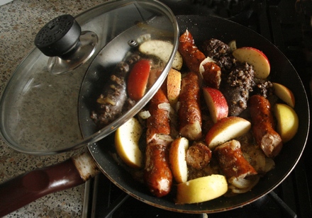Jabłka umyć, przekroić na pół, usunąć gniazda nasienne, miąższ pokroić w cienkie półplasterki. Kiełbasę pokroić na porcje, naciąć skórkę. Ułożyć na nagrzanej patelni, wytopić tłuszcz. Jeżeli tłuszczu za mało, dodać smalec z gęsi lub olej. Gdy skórka kiełbasy zacznie się rumienić, dołożyć kaszankę i plasterki jabłek. Posypać majerankiem i pieprzem. Patelnię przykryć, trzymać na małym gazie (w niskiej temperaturze). Gdy wszystko się zagrzeje i jabłka zaczną mięknąć, zdjąć pokrywkę, zwiększyć gaz (temperaturę), aby skórka na kiełbasie i kaszance lekko się zrumieniła.