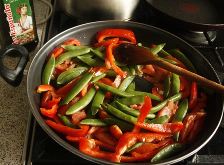 Oliwę lekko rozgrzać w paellerze. Wrzucić na nią oczyszczone i pokrojone w paski papryki oraz pomidory bez wodnistego soku, strączki groszku i posiekane ząbki czosnku. Poddusić.